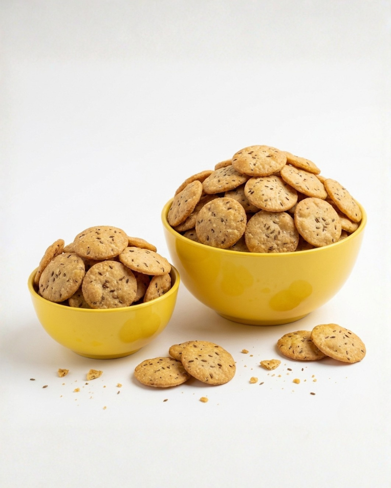 Traditional crispy, bite-sized puris made from premium wheat flour and roasted jeera (cumin), seasoned with mild Indian spices—perfect for light snacking and as an authentic crunchy accompaniment to tea-time moments.